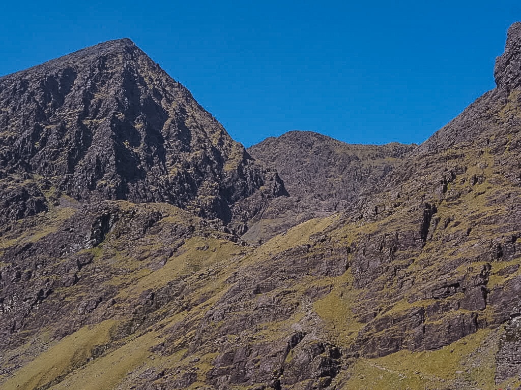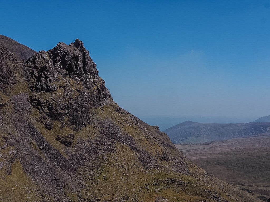 The last section is the one that actually takes you through Brother O’Shea’s Gully. There are two other gully options from this point, with Curved and Central Gullys being more strenuous. Brother O’Shea’s is the farthest to the right and therefore brings you up farthest from the summit of Carrauntoohil, but it’s also the easiest, with a mix of compacted scree and grassy ground, and it’s fairly quick to ascend to the top of the ridge. On a good day like we had yesterday, we were greeted with views across the other side of the Coomloughra Horseshoe to Caher mountain, and even beyond that to Rossbeigh and Inch beaches.