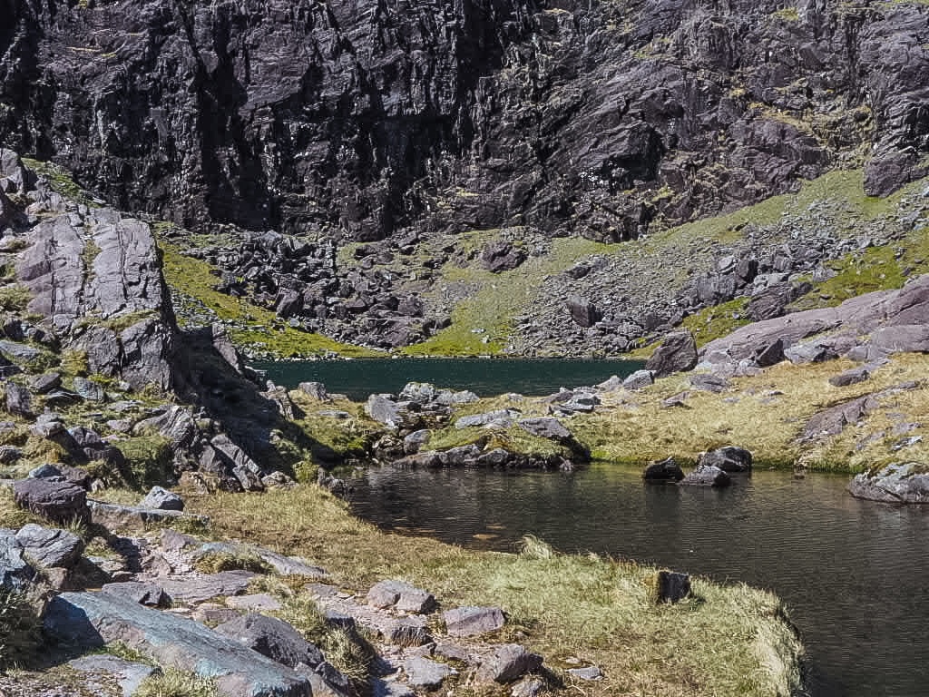 Next is is another long but not treacherous scree scramble. There are lots of small paths along this portion so you can take the route that feels most comfortable to you. When we reached this section we saw the Kerry Mountain Rescue Team doing some training exercises, strapping a dummy onto a backboard and setting up rock climbing gear. Just beyond this is Cummeenoughter Lake. We stopped for lunch here because it was somewhat shielded from the wind.